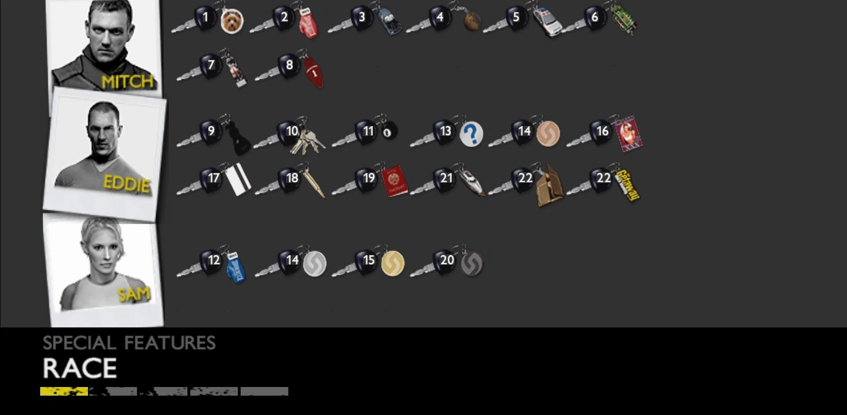 The Special Features screen in the NTSC version of The Getaway: Black Monday. A list of all the key rings the player has collected can be tracked here.