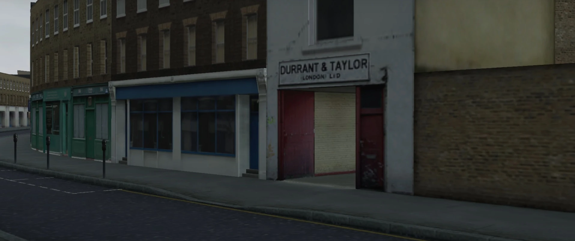 This particular building is first seen in a cutscene of Mission 5, Taxi for Mr Chai?. Jake Jolson wants Mark Hammond to go and drop off the dead body of Johnny Chai, a member of the Triads, outside the Siu Fung, a Chinese restaurant located on Gerrard Street in Chinatown. This will anger the Triads so they will chase after Mark and try to kill him. Jake tells Mark to lure them to a building on Holywell Row, off of Worship Street, and says that he and some of the boys will be there to help massacre the Triads. Mark believes him but doesn't realise that the building on Holywell Row he is heading to is actually a Yardie base and does not belong to the Bethnal Green Mob. Mark does this job, and lures the Triads over to the base where a gang war erupts between the two gangs. This happens in Mission 6, Out of the Frying Pan. Mark takes cover as the two gangs kill each other in the front yard of the building and then he finishes any gang member left off. After the war is over and all of the gang members have been killed, Mark leaves the yard, enraged at Jake, and swears to kill him for nearly getting him killed. Mark then receives a phone call from Harry who tells him about his next job. This occurs in the opening cutscene from Mission 7, Filthy Business. After Harry explains to Mark what he has to do, Mark grabs a vehicle and escapes the area just as the police arrive to deal with the aftermath of it all. This is the last time the Yardie Drug Factory is seen in Mark's story.
